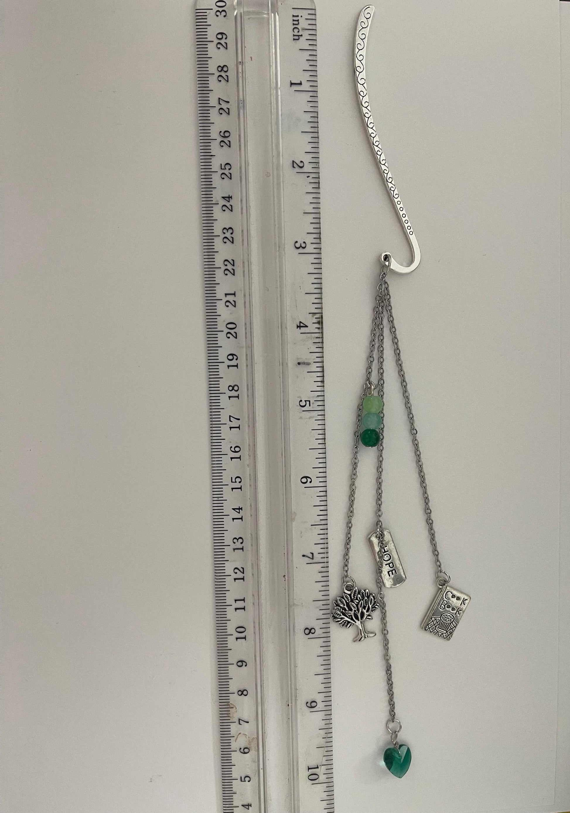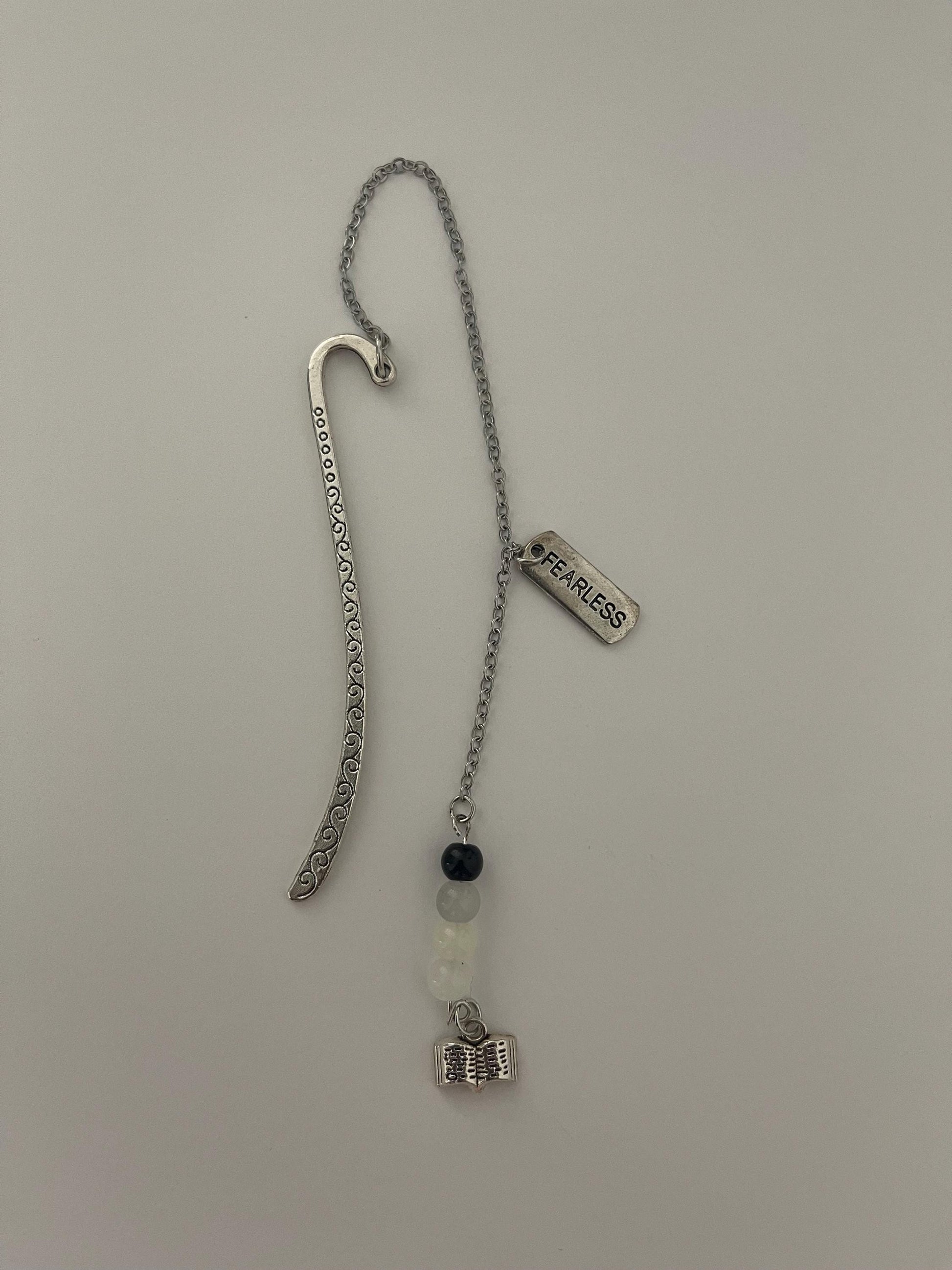 Elevate your reading experience with this elegant 11-inch silver chain link bookmark. One end features a decorative charm accented with colorful beads, while the opposite end has a sleek, lay-flat hook that tucks securely over your page without damaging your book’s spine.